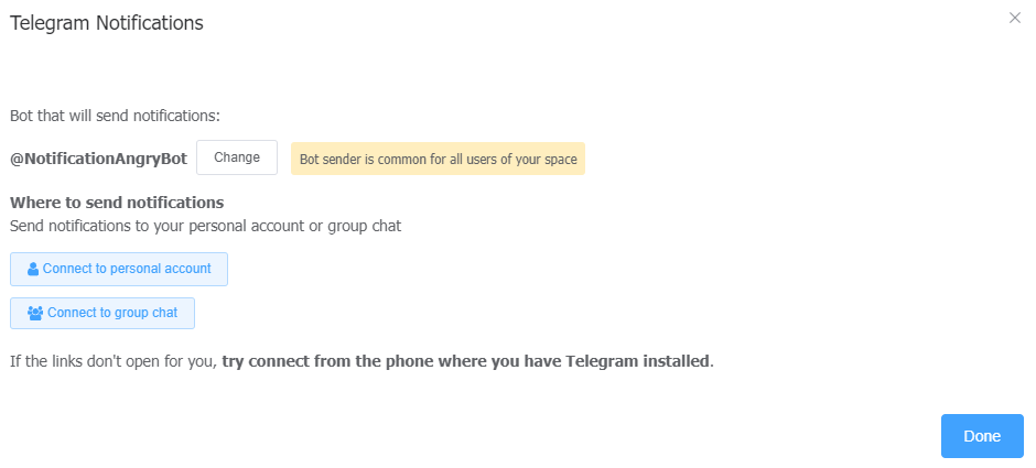 In case you need to configurenotifications to a group chat, first add the sender bot to the required chat, and then write the command /start@BotName your_email in the chat (detailed instructions will be available in the connection window of the service). After that, click the Done button.