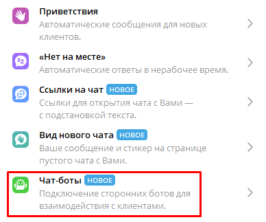 - Перейдите в разделНастройки - Telegram для бизнеса - Чат-боты
