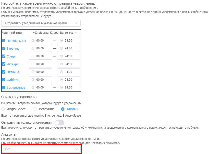 3. В дополнительных настройках проверьте, не установлено ли у вас ограничение по времени, когда должны поступать уведомления, а также, что выбраны все нужные аккаунты, для которых будут отправляться уведомления.